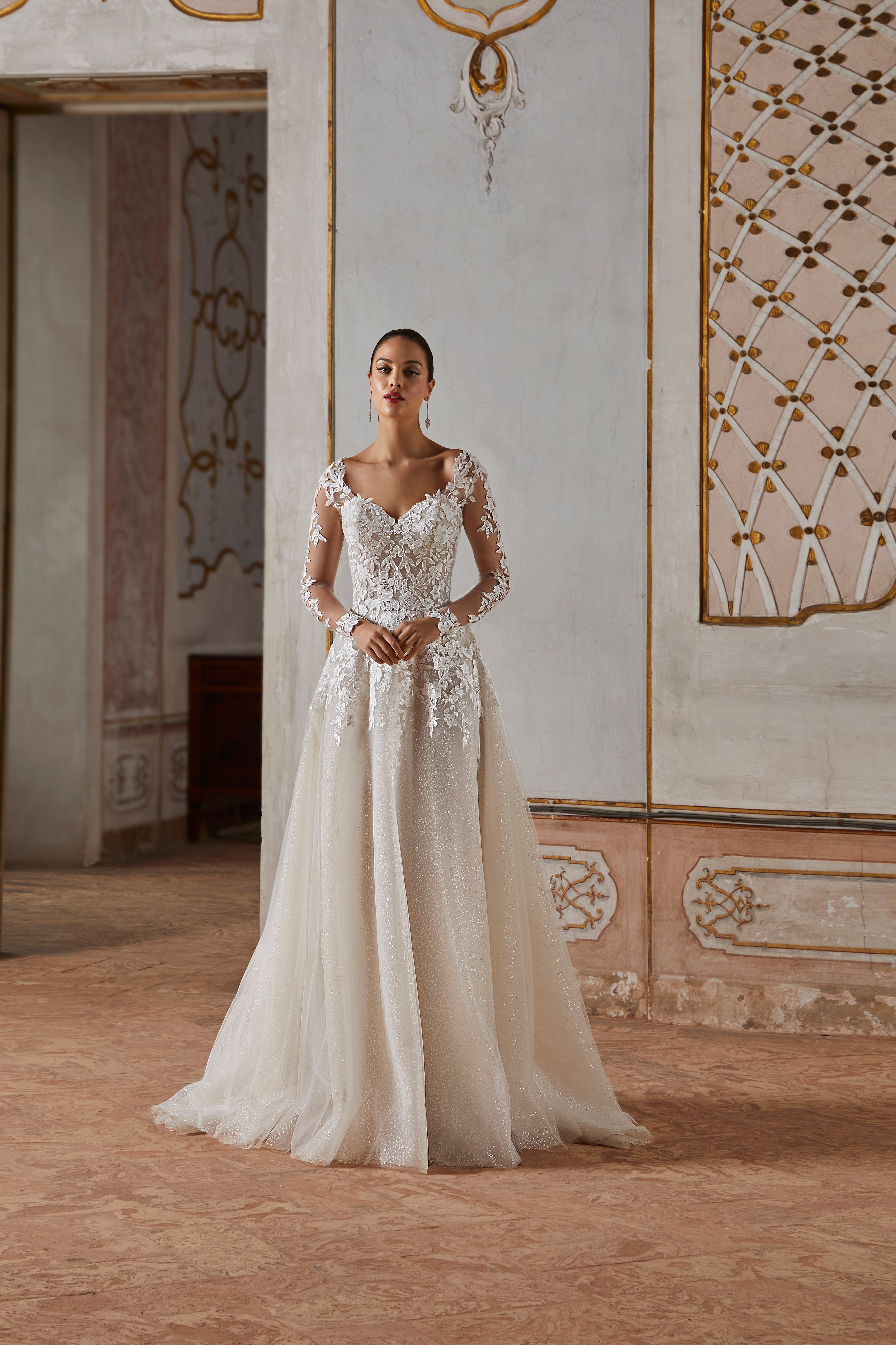 Cette robe de mariée de la collection COSMOBELLA incarne l'élégance et le romantisme. Le corsage, orné de magnifiques broderies florales et d’un décolleté en cœur, s’associe à des manches longues transparentes pour un style à la fois royal et raffiné. La jupe fluide en tulle, agrémentée de subtils reflets pailletés, apporte une touche d’éclat et de magie. Idéale pour une mariée recherchant une allure intemporelle et majestueuse pour son grand jour.