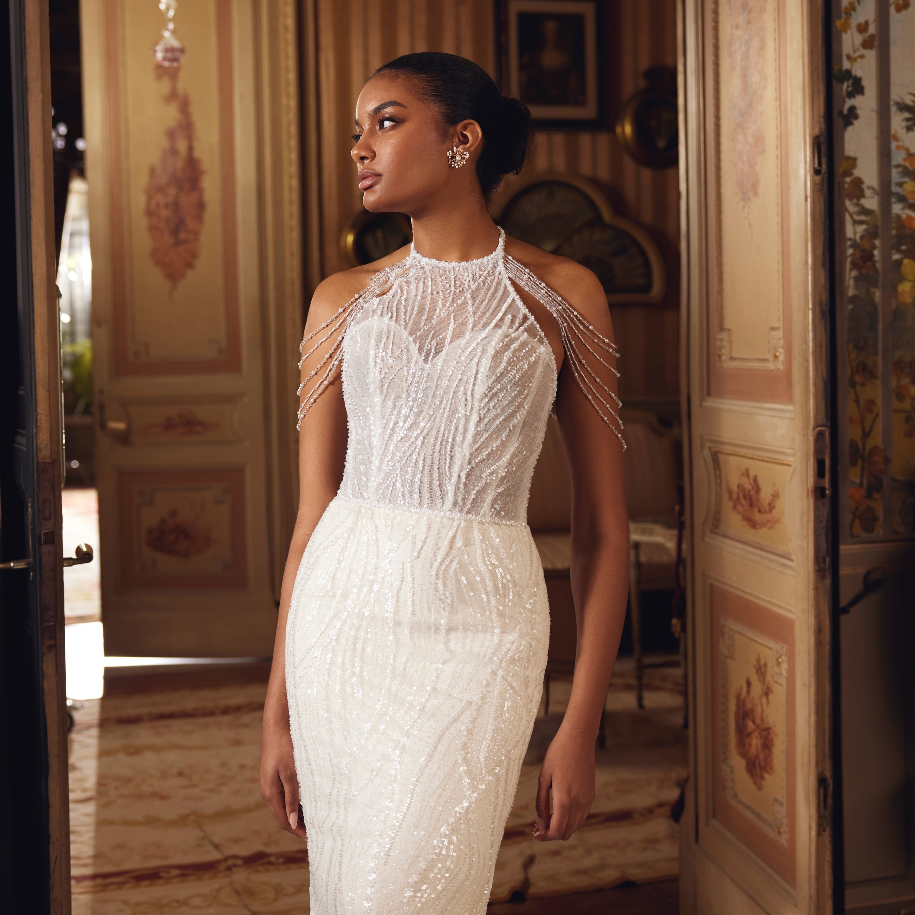Robe sirène ornée de perles scintillantes et d'un col halter sophistiqué, parfaite pour un look glamour et moderne.